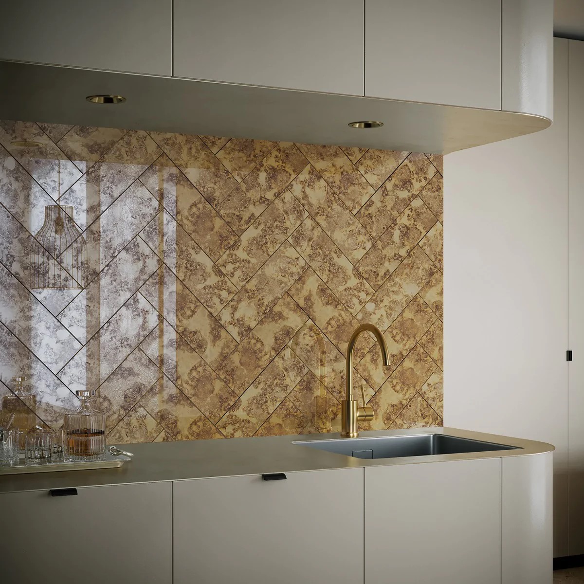 Our Antique Mirror collection is a beautiful way to add depth to any design. Produced in the colors of Silver and Gold, our Antique Mirror gives a dramatic flair to backsplashes using either 3×6 or 6×18 sizes.
