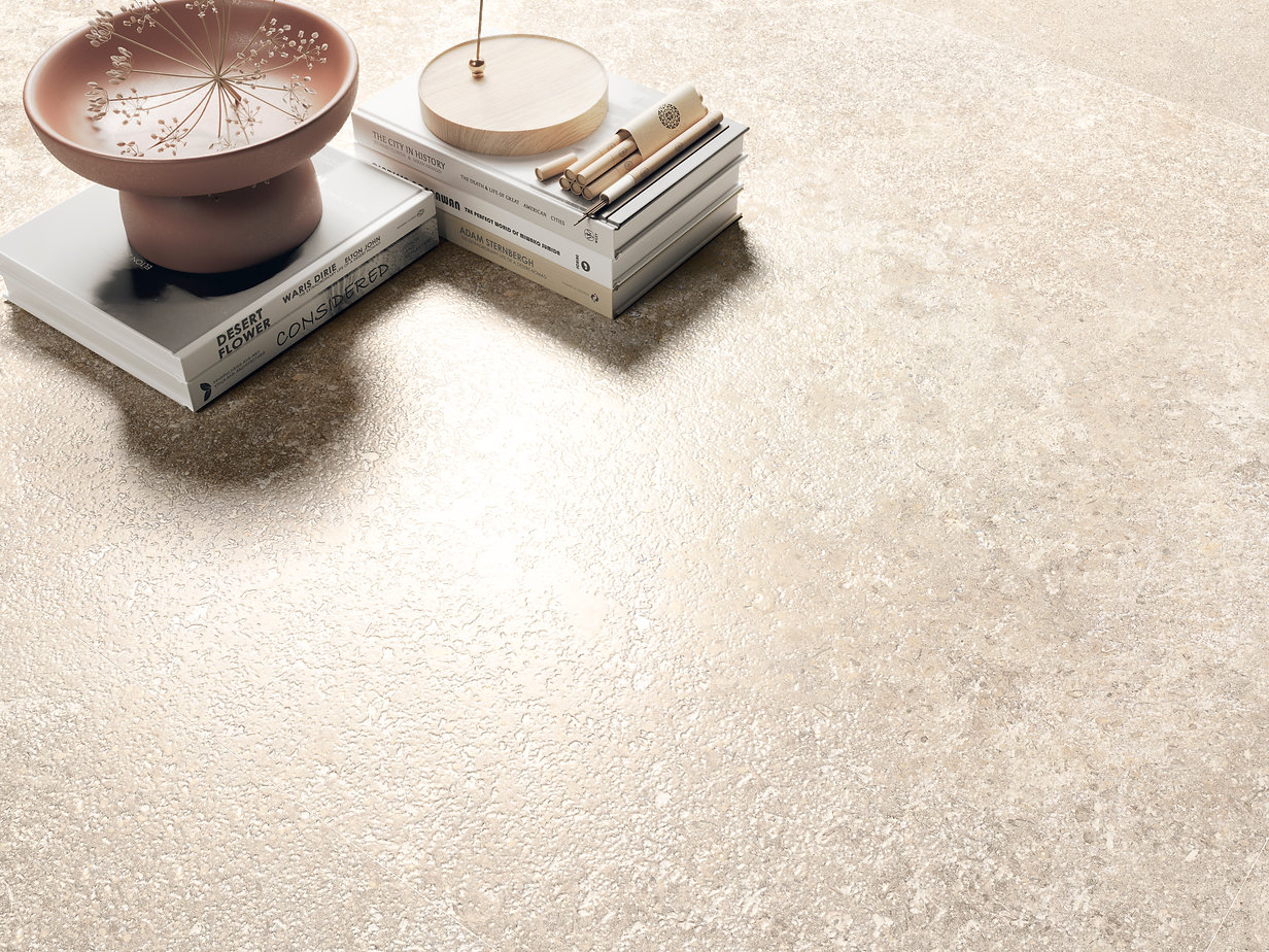 The Bellastone collection is available in three colours: Bone, Cream and Greige. The Bone shade evokes the warmth and serenity of natural landscapes, bringing a sense of tranquillity and comfort to interiors. Conversely, Cream immerses us in the warmth of earthy tones and Greige reflects the strength and sobriety of stone, creating elegant and sophisticated environments. These colours, combined with 3D technology, enable endless customisation, adapting to both classic and contemporary decorative styles.