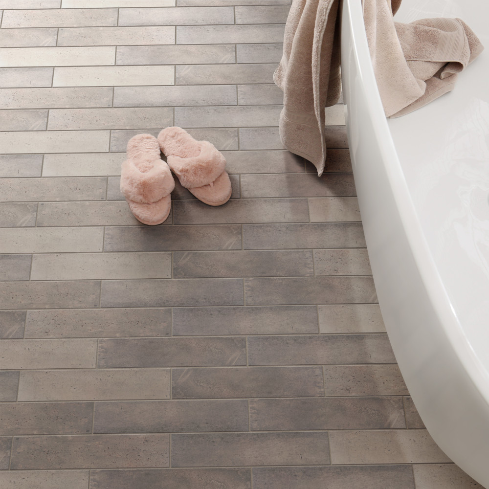 Modeling a stone look, our Brooklyn Porcelain Floor and Wall Tile features a smooth, glossy finish, providing decorative appeal that adapts to a variety of stylistic contexts. The Hexagon contain 12 different print variations that are randomly distributed throughout each case; the 3×12 brick have 20 and the fluted Legato have 5.