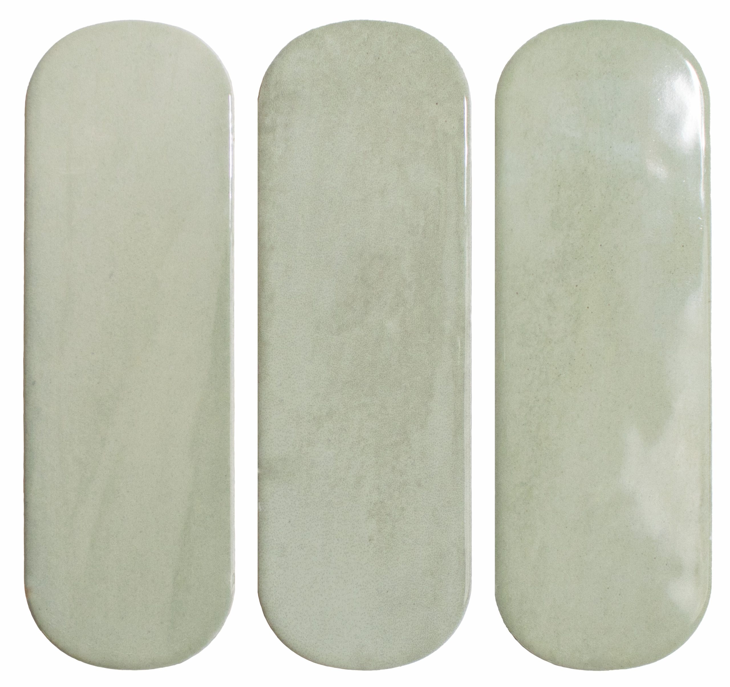 Available in the colors of Greige, Cloud, Shadow, Tea, Clover, Sky, Ocean (gloss) and White (matte & gloss). Size is 2×6.3 rectangle, 2×6.3 Oval and a matching .43×6.3” Edge Trim