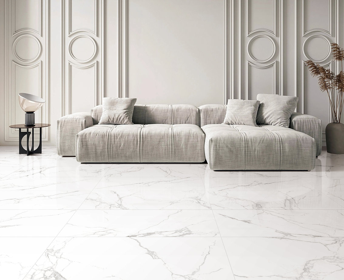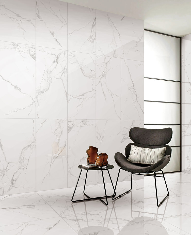 Carrara Nuevo: Since Michelangelo carved “David” in 1504, Carrara marble has been used for numerous buildings and homes around the world. Our Carrara Nuevo is a reimagined Carrara porcelain; utilizing 21st century technology to pay tribute to the iconic marble from the hills of northern Tuscany. Available in polished 12×24, 24×48 and 2×2 mosaic.