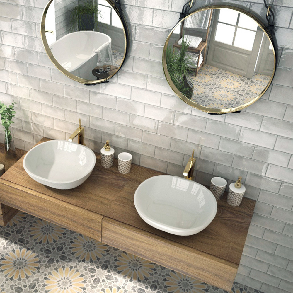 Context. The square cut edges contrast with the undulated finish, giving it a contemporary hand made style.  This 4×8 ceramic wall tile is available in 6 different colors with a matching deco containing 11 different print variations that are randomly distributed throughout each case.