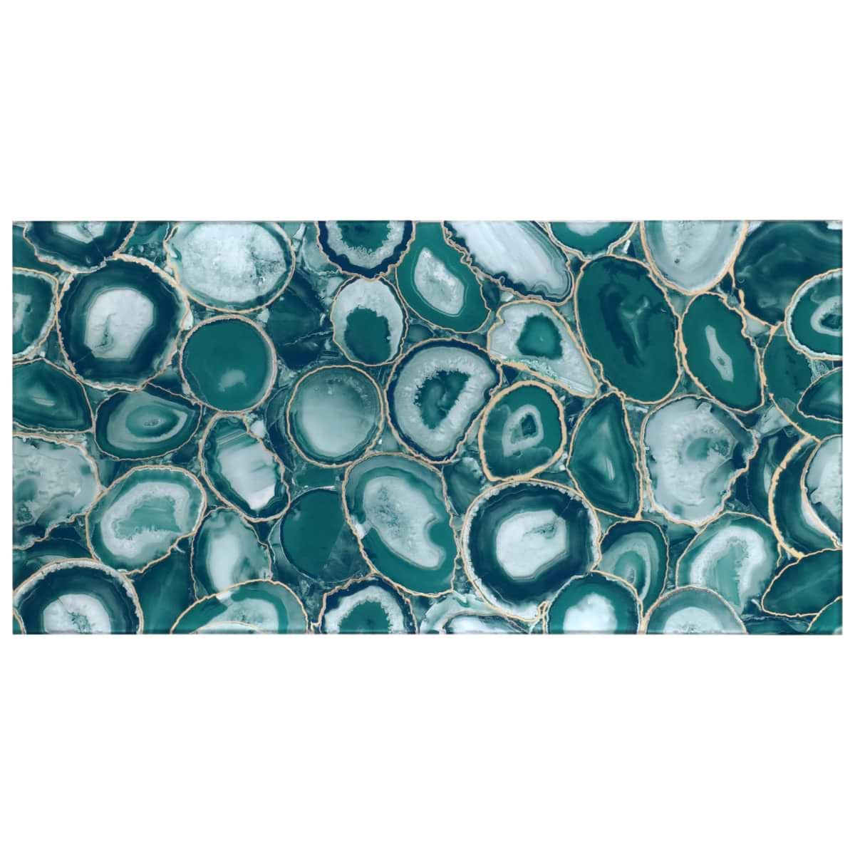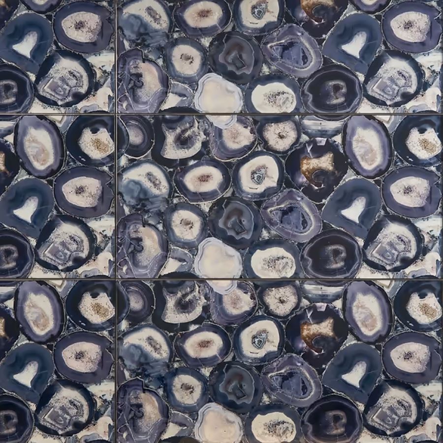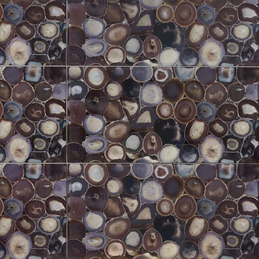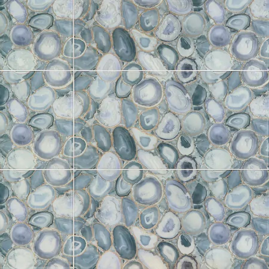 GEMGLASS. Taking millions of years to form, Thunderegg geodes are filled with agate, jasper, opal and quartz crystals. GEMGLASS replicates sliced geodes of Teal, Lilac, Deep Sea Blue and Silver Peal in this 18×36” high gloss glass tile.