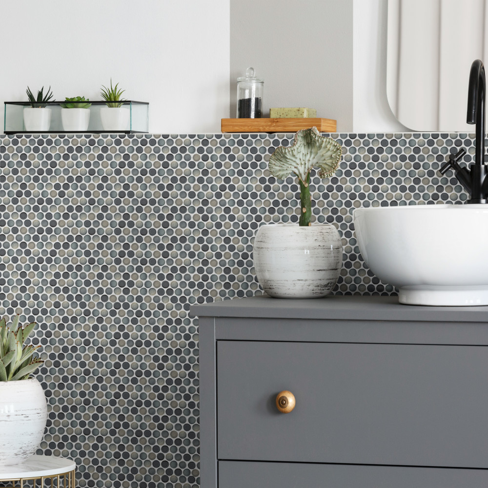 Our Lincoln Circle Porcelain Mosaic features a smooth, matte and gloss finish, providing decorative appeal that adapts to a variety of stylistic contexts. With its impervious, frost-resistant features, this penny-round mosaic is an ideal selection for a variety of spaces including indoor and outdoor residential installations, bathrooms, back splashes, showers, hallways, pools and fireplace facades.