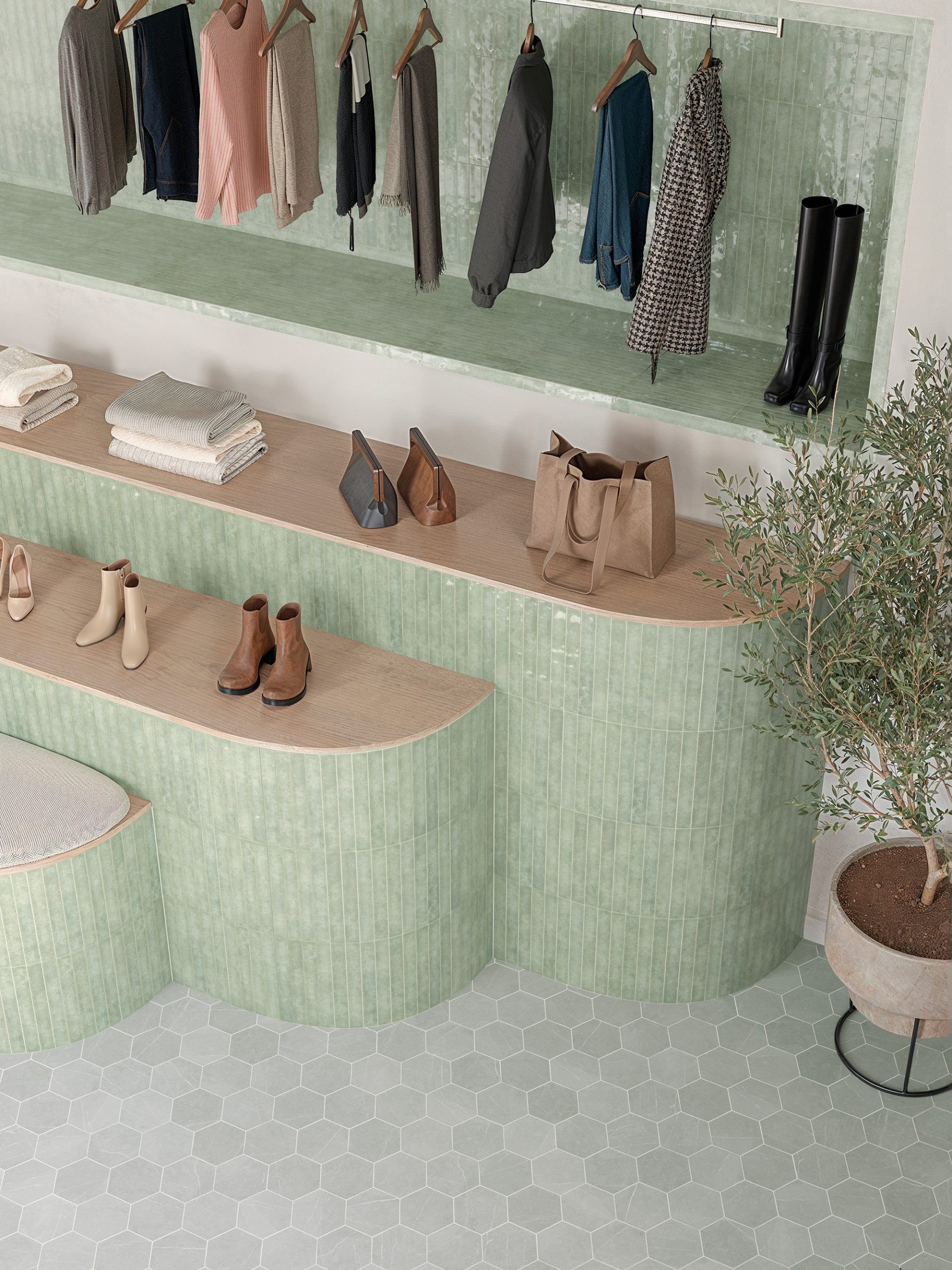 Each piece carries a sense of serenity, wind, and horizon, connecting subtly with nature. “Mistral” is created in 1.5×12” in the eight colors of Aquamarine, Bone, Forest, Indigo, Khaki, Lavender, Opal Blue, and White (gloss).