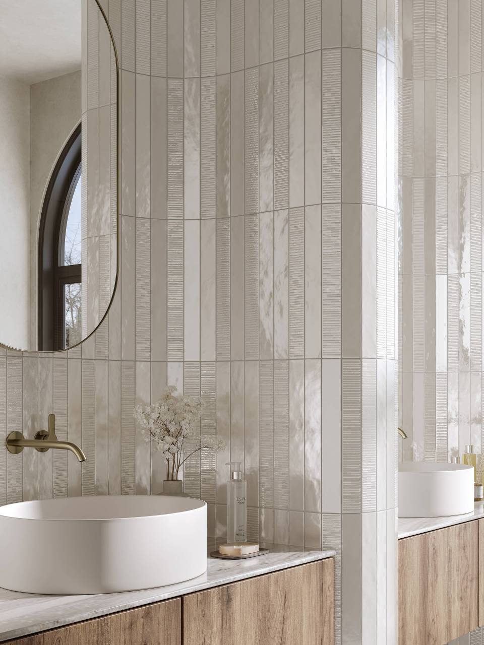 Murano celebrates the art of Venetian glass in vibrant shades. Its 2×17” glossy finish amplifies the intensity of the colors, while the textured (Verti) versions add artistic depth to the environments.