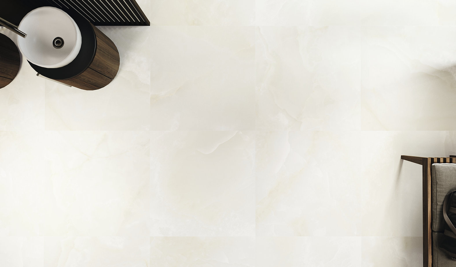 ONIX: Inspired by the sublime beauty of onyx. Its refined texture features golden veining and translucent cream tones, creating a serene, sophisticated aesthetic. This marble finish elevates any space, transforming it into a luxurious sanctuary of tranquility and grace. Available in polished “Beige” and “Blanco” in 48×48 and 2×2 mosaic.