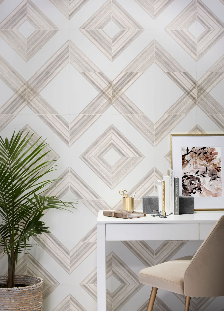 Outline. A 12×12 monochromatic surface in pure and simple black or white with special decorative elements of fine metallic lines.  Three different patterned tiles create dozens of design opportunities.