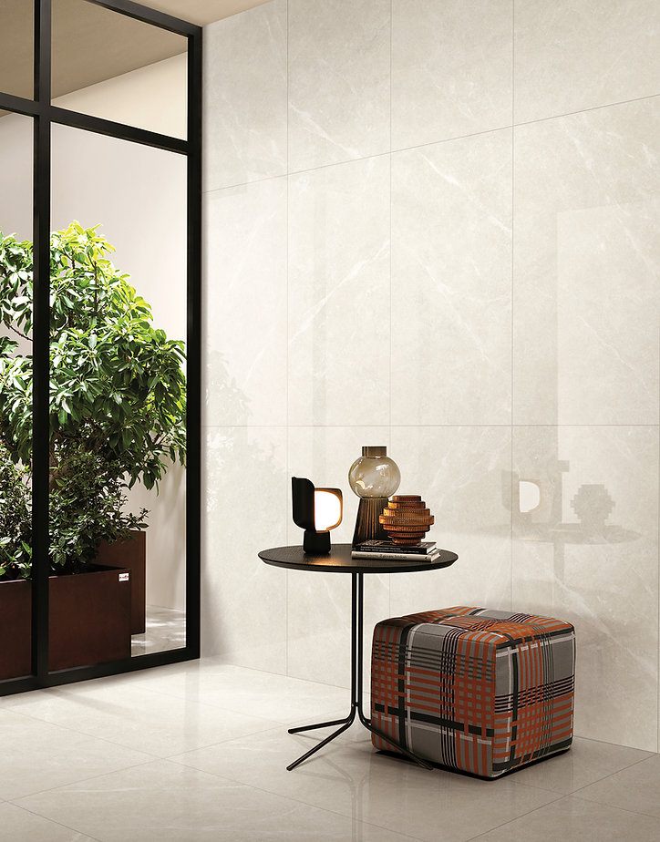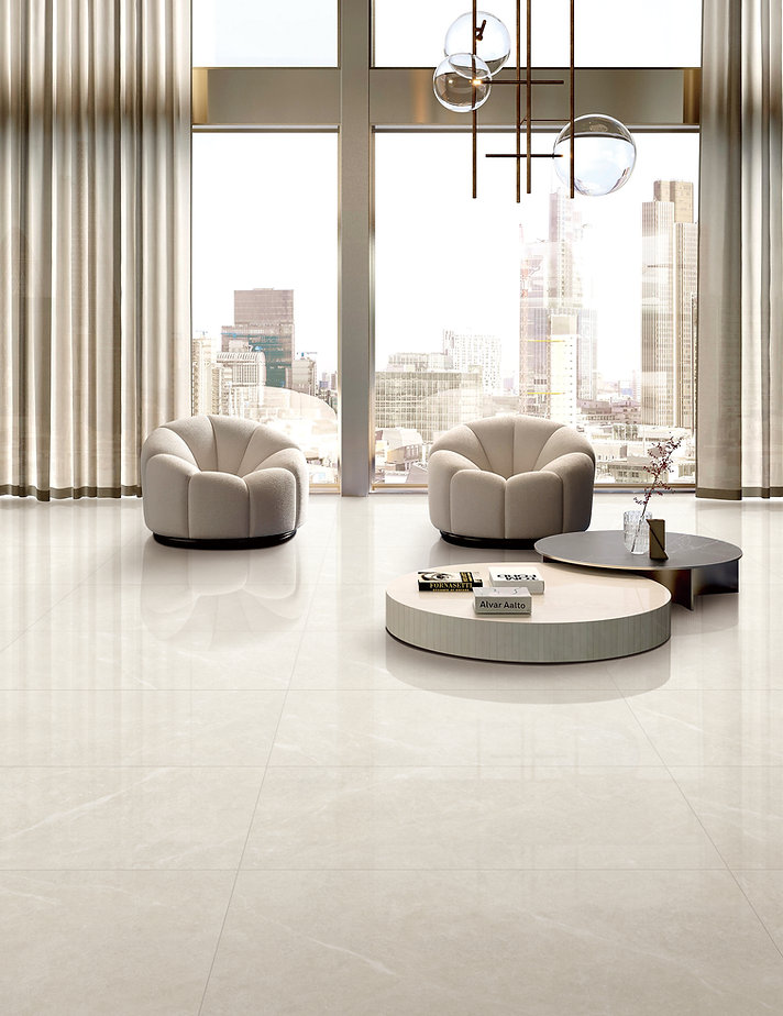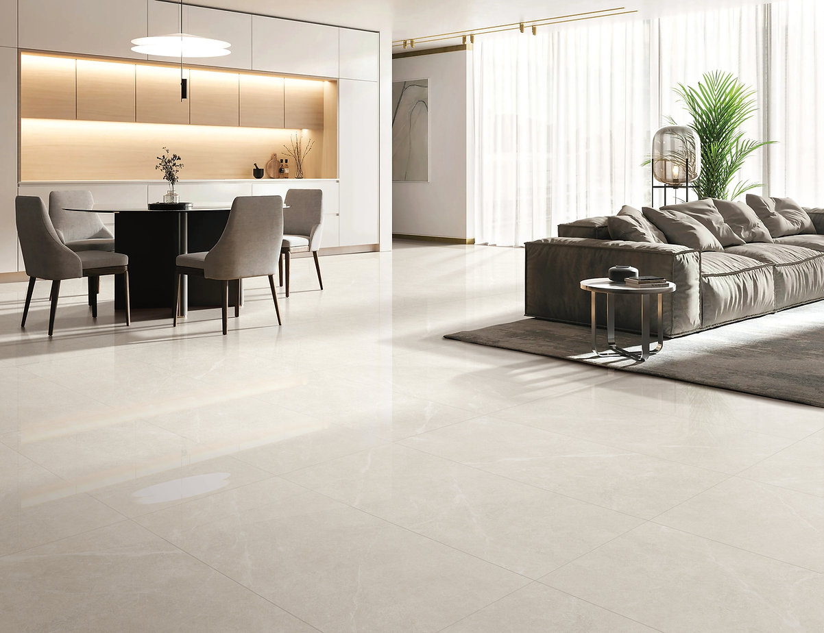 ROYAL BATTICINO:is an advanced material that mimics the tranquility and sophistication of natural stone. Its refined production process yields a marble-like look with soft white veins on a pearly cream base. This blend achieves a visually striking and harmonious appearance. Available in 12×24 and 24×48 polished and 2×2 mosaic.